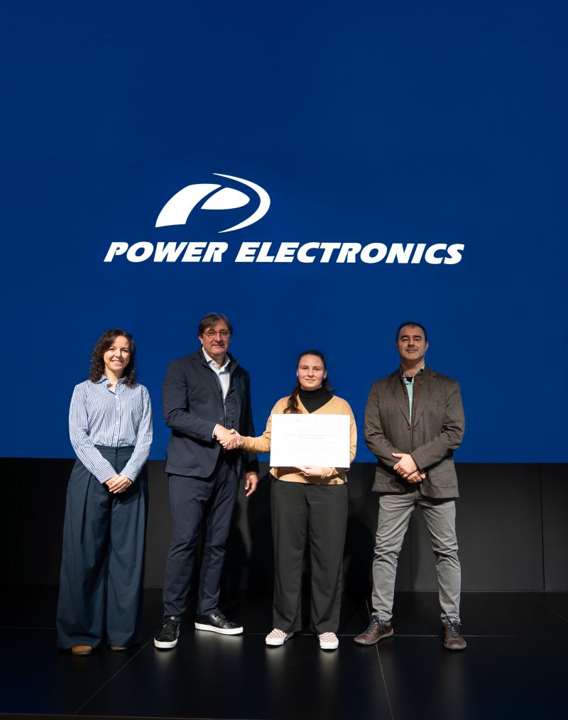 Ra煤l Rodr铆guez, Director de la C谩tedra Power Electronics-UPV y Consuelo G贸mez-Zarzuela Quel, Gerente de Relaciones Universitarias, asistieron al acto donde Lalo Salvo, Vicepresidente T茅cnico de Power Electronics, entreg贸 el premio a Mar铆a Moreno Ortega, actual miembro del equipo en Power Electronics como ingeniera de software de investigaci贸n y desarrollo. 隆Enhorabuena Mar铆a! 馃憦